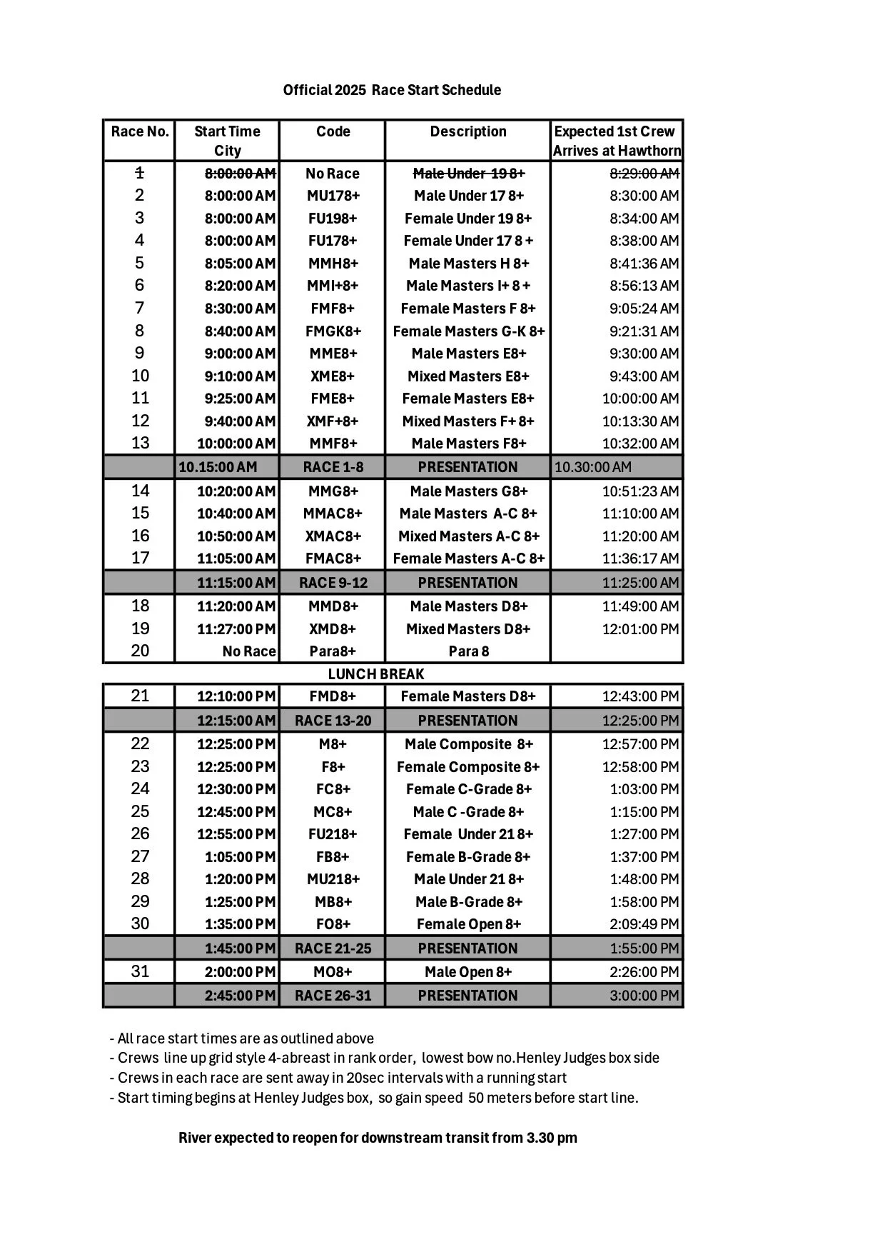2025 Race Start Schedule